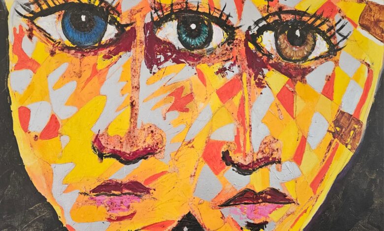In alcune delle sue opere, l’occhio si ripete fino a diventare una galassia di sguardi, cerchi che si riproducono in uno spazio brulicante di colori densi, come se cercasse di vedere il mondo da tutte le angolazioni contemporaneamente. È il desiderio di possedere la verità attraverso la molteplicità degli occhi, come se il caos fosse il suo unico mezzo per l’ordine interno.